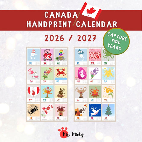 This is a 2026–2027 printable handprint calendar with 24 monthly pages and Canadian holidays. It’s made for parents and teachers who want an easy, paint-based keepsake kids can complete month by month.