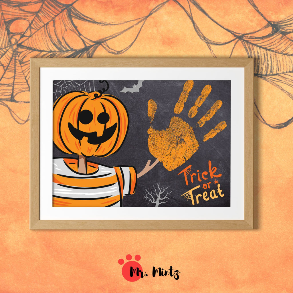 This fun and engaging Halloween craft features a pumpkin-headed figure offering a vibrant orange handprint on a chalkboard-style background. Perfect for kids, this printable activity combines creativity with festive Halloween spirit.